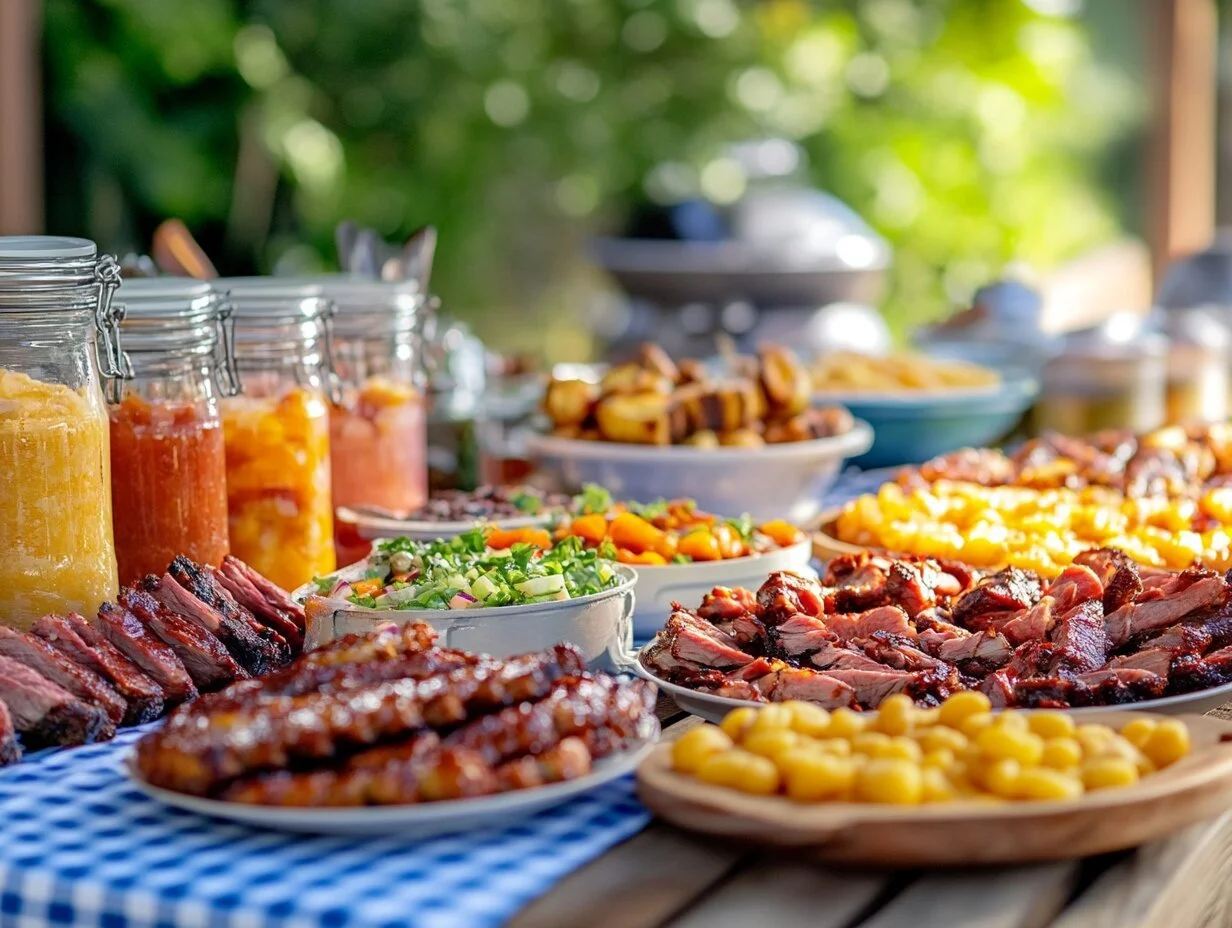 Classic BBQ options include smoked meats like brisket, ribs, and pulled pork, accompanied by sides such as coleslaw, baked beans, and cornbread. Don’t forget dessert options like peach cobbler or banana pudding.